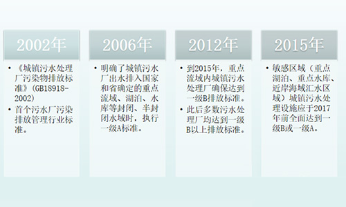 2012年12月24日,國家環境保護總局與國家質量監督檢驗檢疫總局聯合發布《城鎮污水處理廠污染物排放標準》(GB18918-2002),只有出水作為回用水的污水處理廠污水處理采用一級A排放標準,其他排入地表水的均采用一級B及以下標準。然而,隨著我國污水排放總量大幅增加,水污染日趨嚴重,我國對污水處理廠的排放標準愈加嚴格。2015年4月2日,國務院發布的《水污染防治行動計劃》中提到要加快城鎮污水處理設施建設與改造,現有城鎮污水處理設施,要因地制宜進行改造,2020年底前達到相應排放標準或再生利用要求。敏感區
